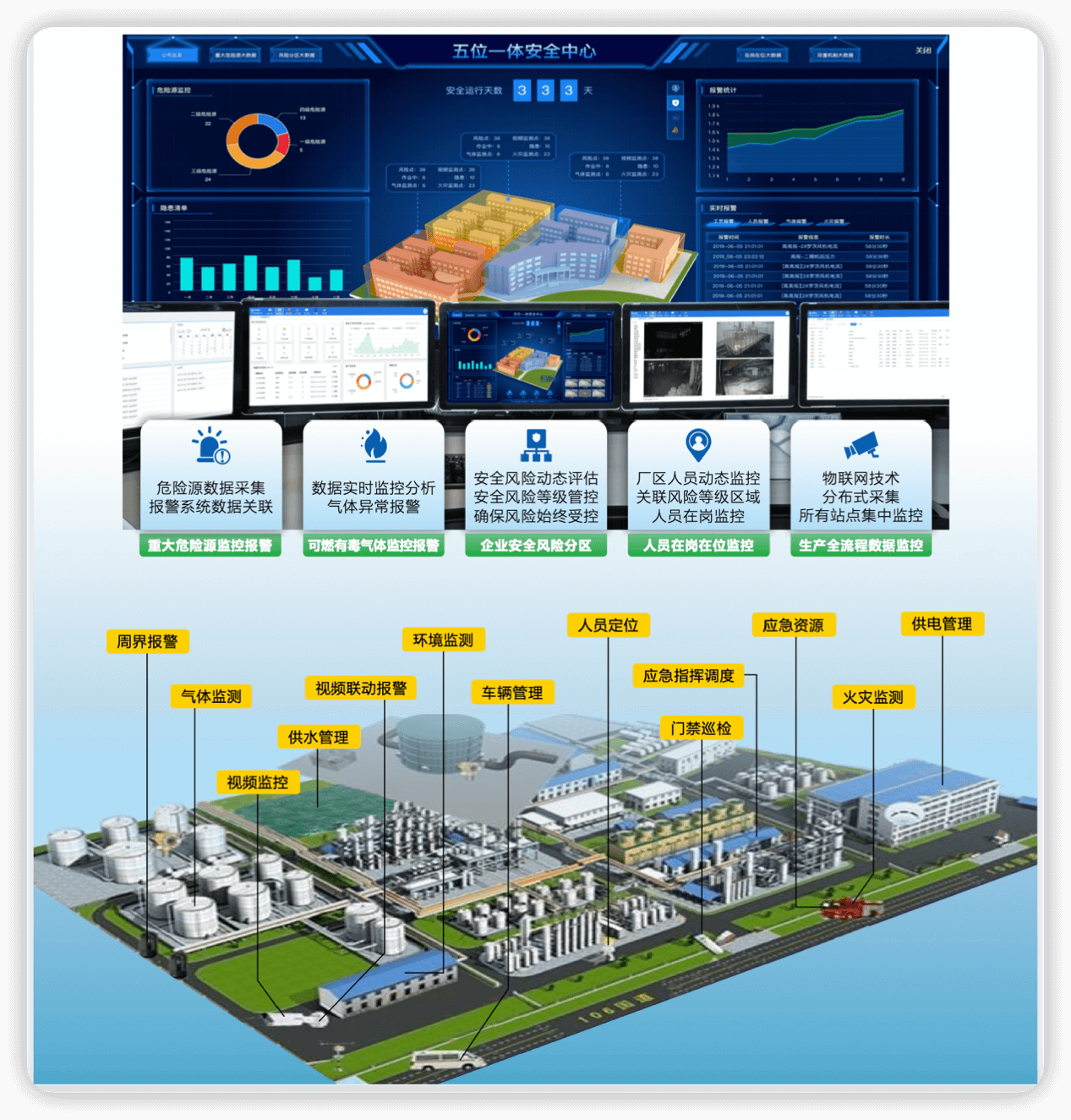 正泰中自化工企业安全生产管理解决方案,基于其公司多年化工生产安全管控经验积累及正太集团“一云两网”技术平台,实现重大危险源监控、可燃有毒气体监控报警、企业安全风险分区管理、人员在岗在位管理、生产全流程数据监控等。